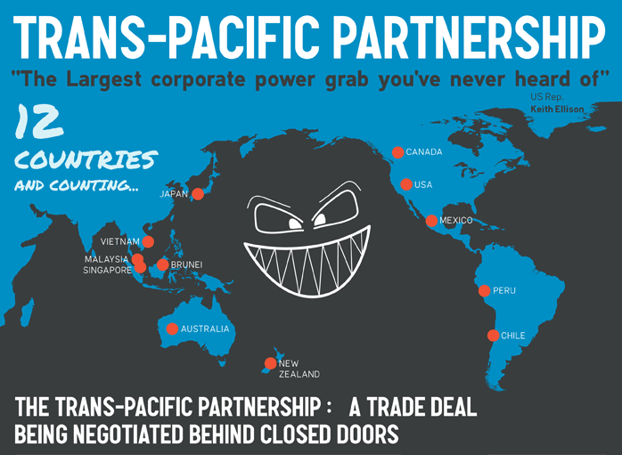The newest step in the elite’s quest for complete globalization is called the Trans-Pacific Partnership (TPP). It is the newest of the “Free Trade” agreements from the same multinational corporations who gave us the General Agreement on Tariffs and Trades, (GATT), the North American Free Trade Agreement (NAFTA) and the World Trade Organization (WTO). This new TPP deal has been called NAFTA on steroids, and just another example of how these trade deals are never just trade deals. Of the 29 chapters in the TPP, only 5 of them have anything to do with trade, with the other 24 being hailed as a Corporate Wish-List. The rest set a dangerous precedent with an international tribunal to put an end to internet sovereignty.