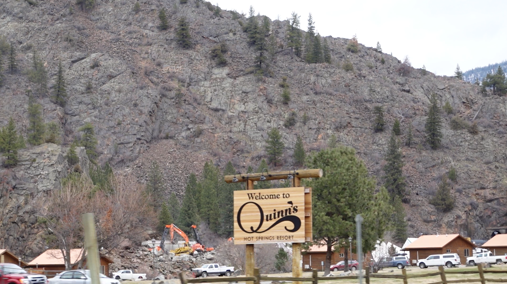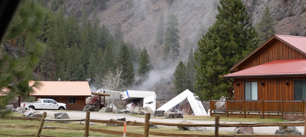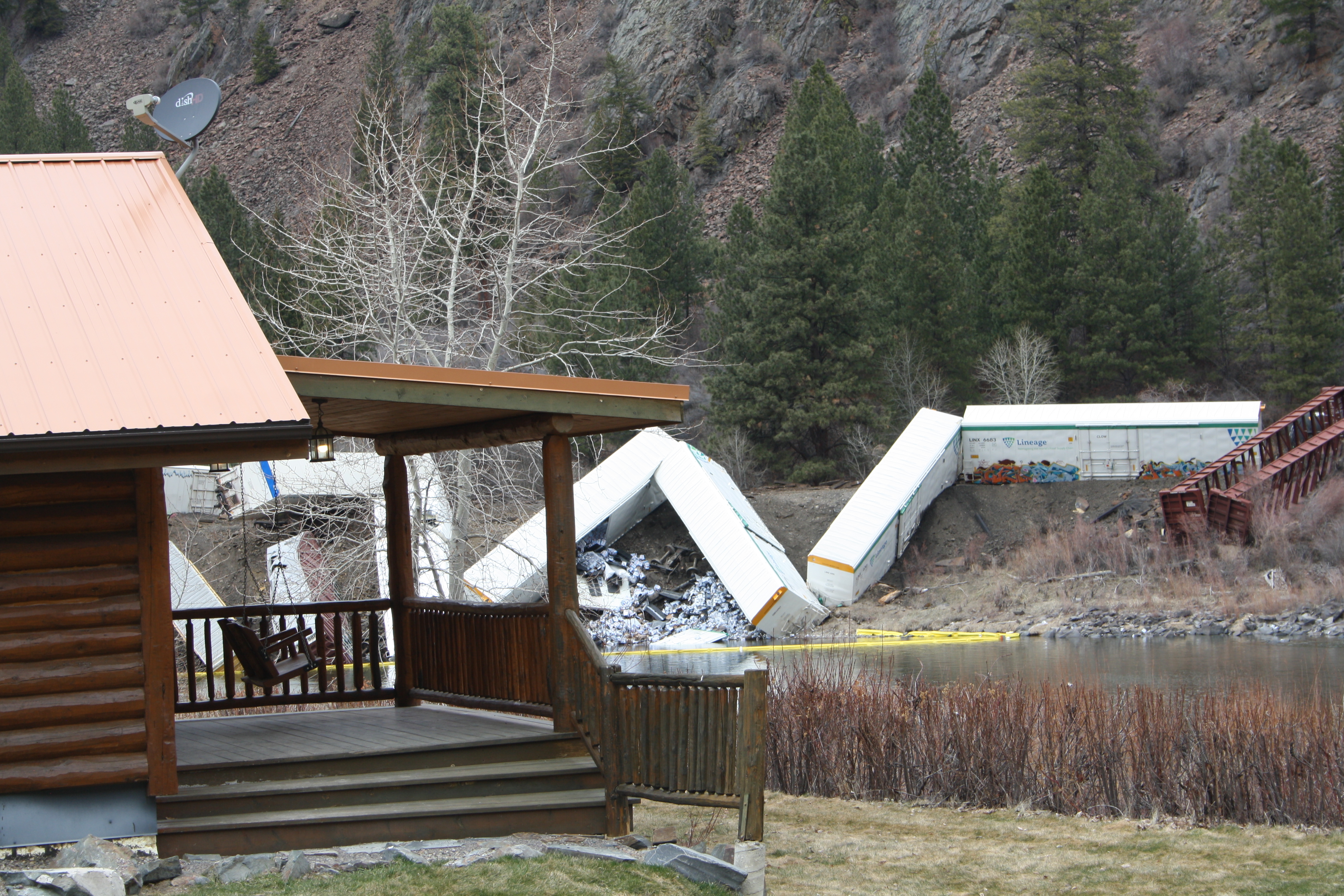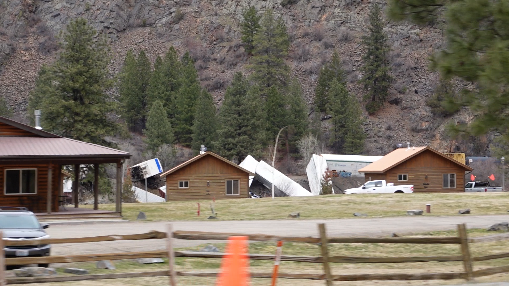At least 18 rail cars stacked up against a tunnel entrance directly across the river from Quinn’s Hot Springs Resort. Guests of the resort staying in the waterfront cabins were temporarily evacuated as a precautionary measure. At least 2 chemical tanker cars derailed with one tipped over on the tracks and one stuck in the mouth of the tunnel. Workers struggled through the week to free the cars that went off track within the confines of the tunnel. Images show steam rising from the derailment site where heavy machinery works on the cliffs above and a crew dressed in orange floating along the river in an inflatable boat. Surveillance footage from Quinn’s Resort shows the cars piling up and falling down the steep banks toward the river at around 9 am.