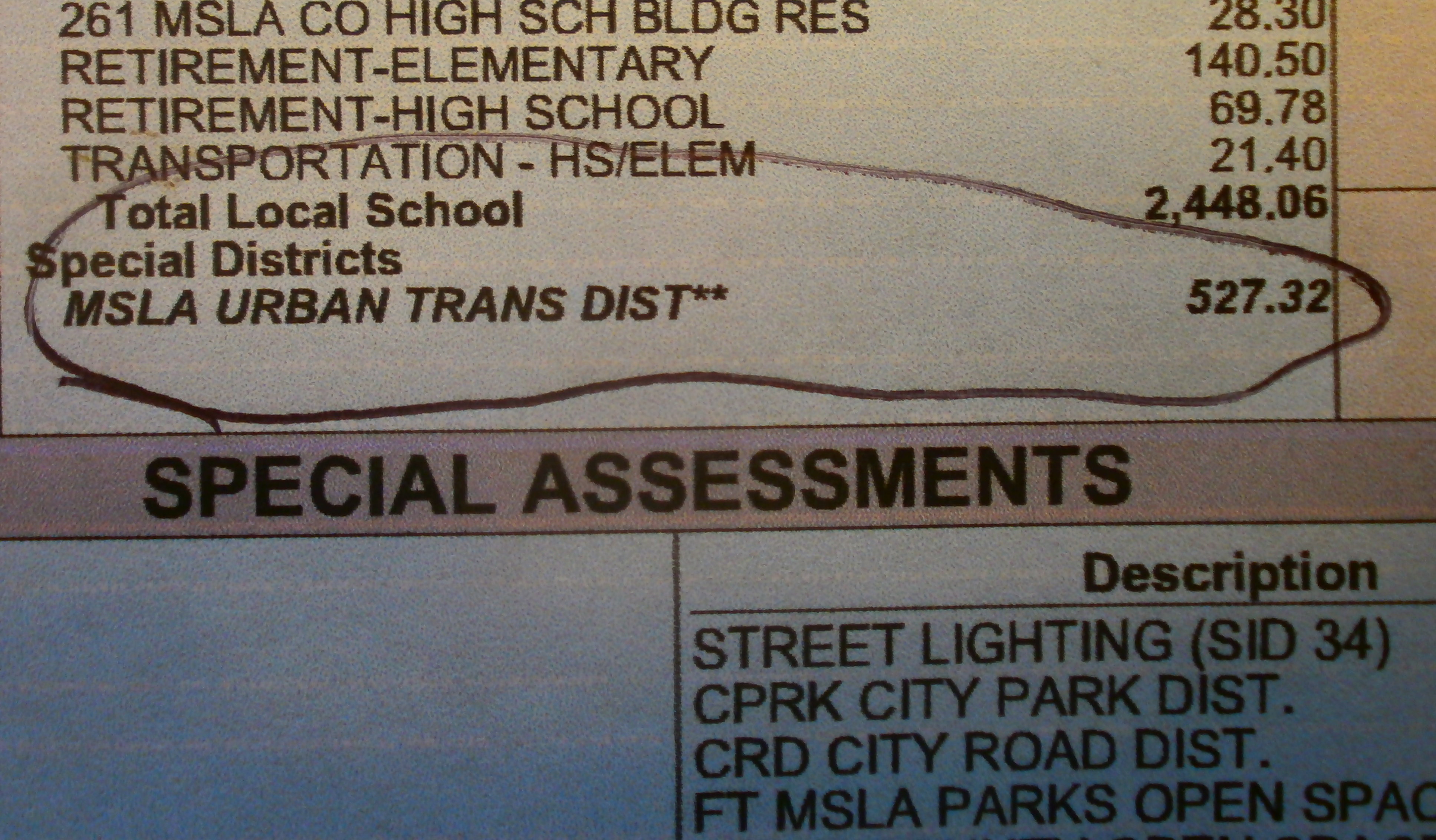 He goes on to explain how the City has hidden the Mountain Line fee on Missoulians’ property tax bills. “They hide it on there as MSLA URBAN TRANS DIST but a lot of people wouldn’t even know what that means. But then they see, holy crap, I’m paying all this money for a bus system that I’m not really using. They’re just hauling a small amount of transients around